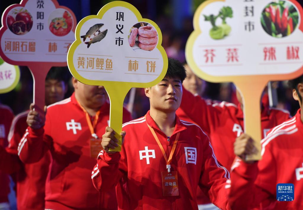 9月15日,郑州告成镇代表队成员在入场仪式上展示郑州特色农产品。新华社记者 李嘉南 摄