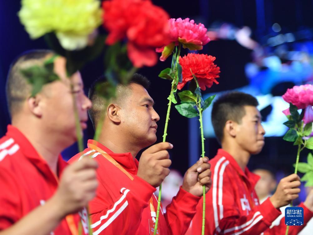 9月15日,洛阳平乐镇代表队成员在入场仪式上手举洛阳牡丹。新华社记者 李嘉南 摄