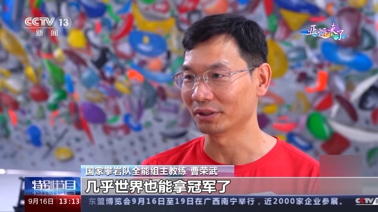 国家攀岩队全能组主教练 曹荣武:攀岩项目在整个世界来说,亚洲是非常强的,如果亚洲能拿冠军,那世界也能拿冠军了。我们相信能通过我们这段时间的针对性训练,东道主的优势各方面综合起来,我们是有希望去获得女子冠军和男子奖牌的。