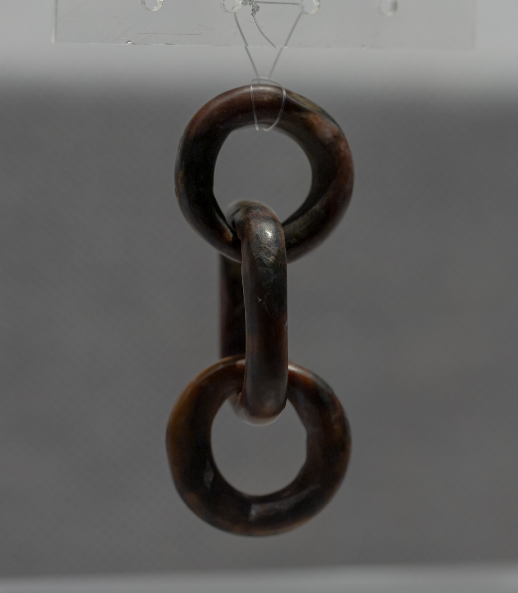 △玉环链 商代晚期 金沙遗址博物馆藏 推测应由一块完整的玉石掏雕而成,也说明在玉器加工中已出现“活环掏雕”的技艺。