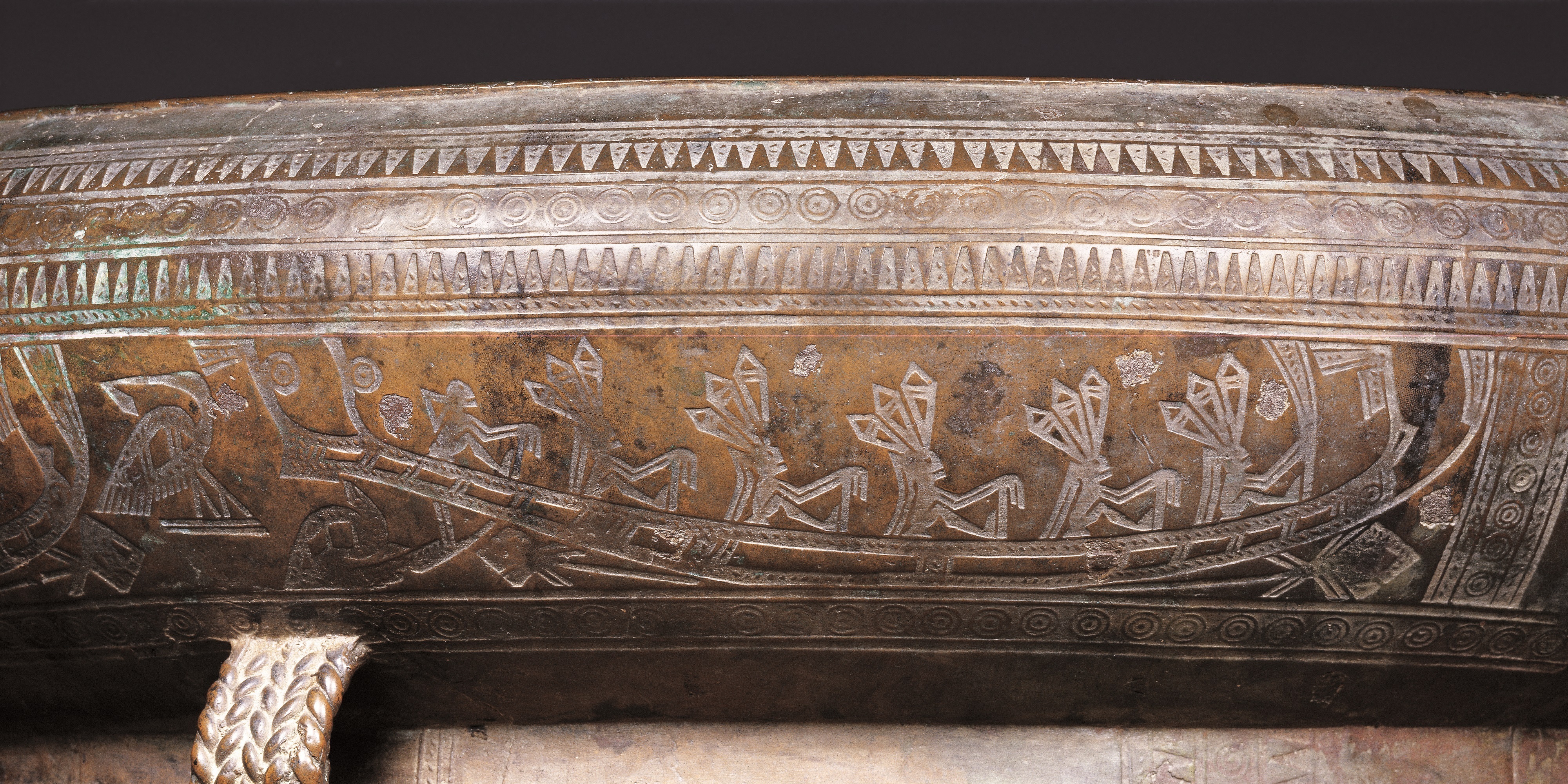 △翔鹭纹铜鼓,鼓身饰有羽人划船纹和羽人舞蹈纹。广西壮族自治区博物馆藏