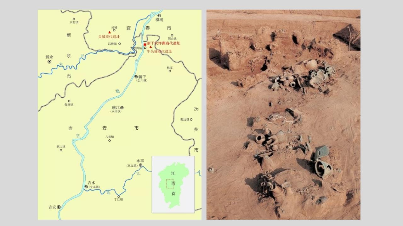 △新干大洋洲商代遗址位置图、发掘现场