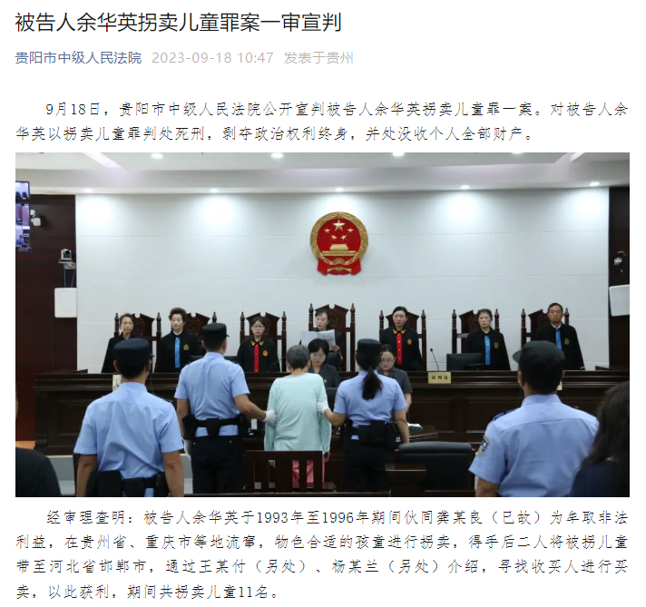 9月18日,贵阳市中级人民法院公开宣判被告人余华英拐卖儿童罪一案。对被告人余华英以拐卖儿童罪判处死刑,剥夺政治权利终身,并处没收个人全部财产。
