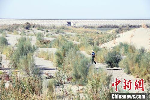 中新网新疆阿克苏9月18日电(记者 关雪昭 孙亭文)翻越连绵起伏的沙丘,记者跟随“高质量发展调研行”采访团来到新疆阿克苏地区阿瓦提县艾西曼区域生态修复及荒漠化治理工程核心区。