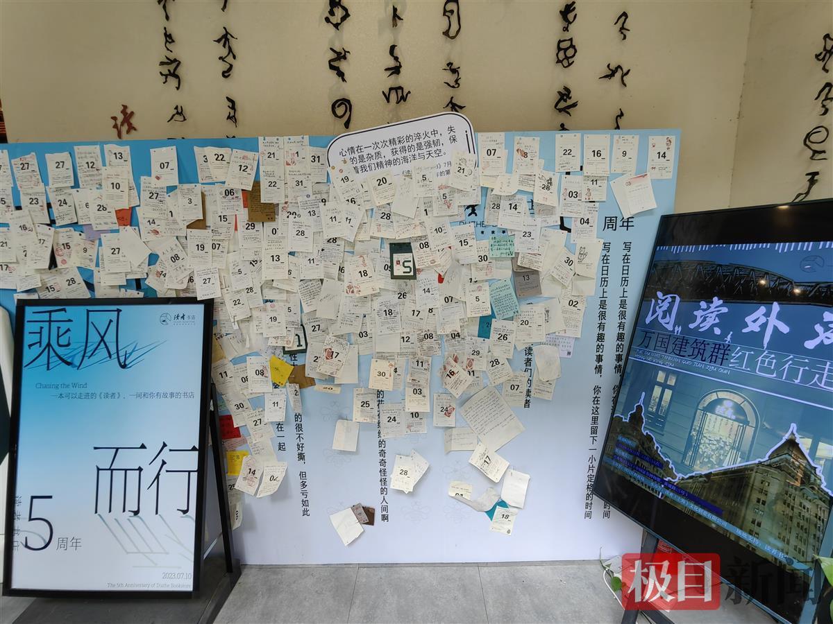 顾珺和她的两名同事,正在书店门口的留言板前拍照。板上厚厚几层小纸片记录了5年来读者的留言,大多是他们对自己或亲友的勉励、对“读者”及书店的美好祝福。留言板下方,书店5周年活动的店招色彩明丽,“乘风而行”几个大字十分醒目。
