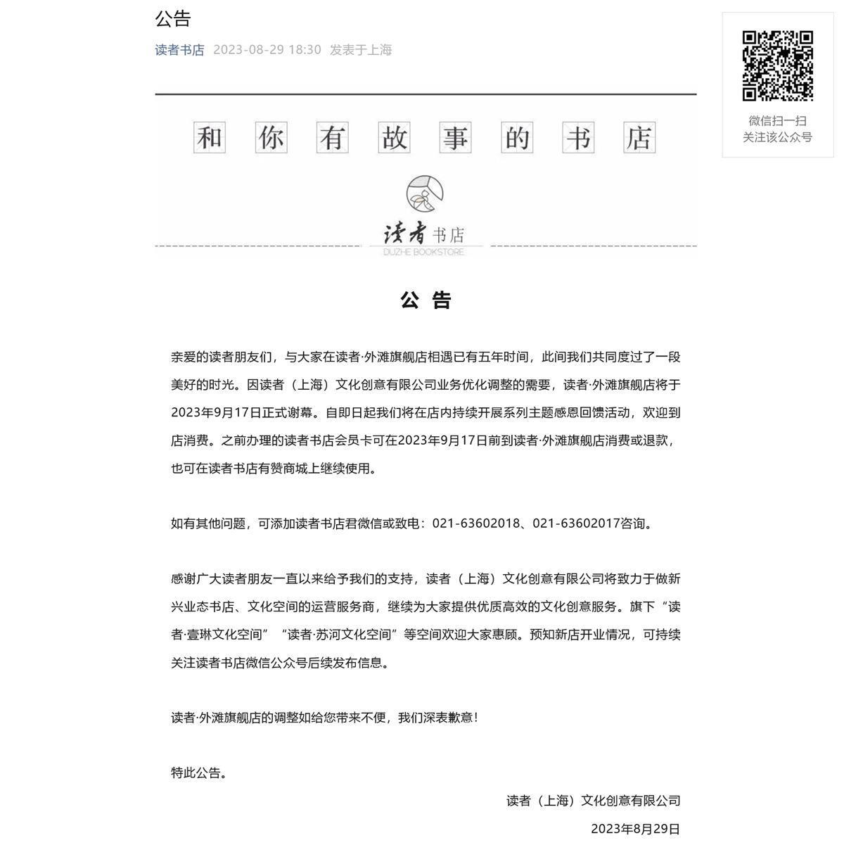8月29日,读者书店发布了闭店消息。公众号公告称,因读者(上海)文化创意有限公司业务优化调整的需要,读者·外滩旗舰店将于2023年9月17日正式谢幕,店方对给读者朋友们带来的不便深表歉意。