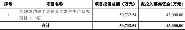 本次可转债的募集资金为人民币43,000.00万元,扣除发行费用(不含税)后的募集资金净额为42,327.69万元,扣除发行费用后的净额,拟用于车规级功率半导体分立器件生产研发项目(一期)。