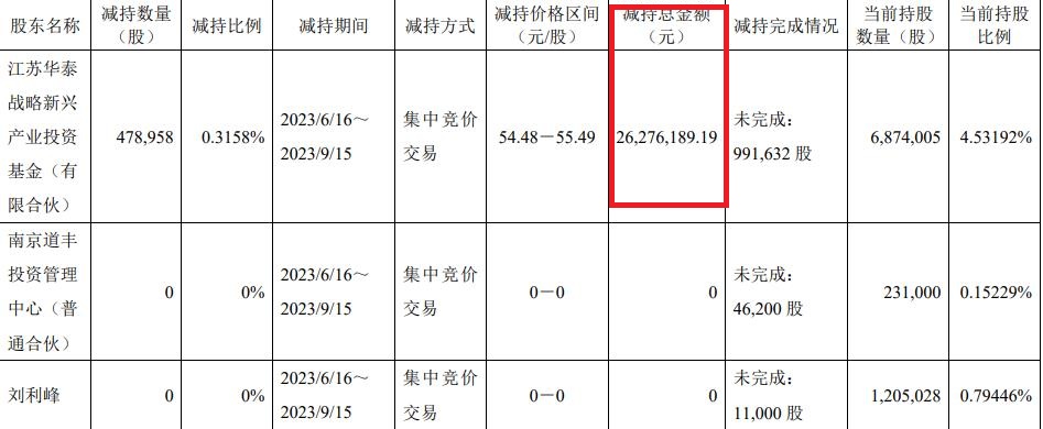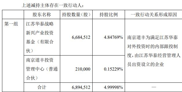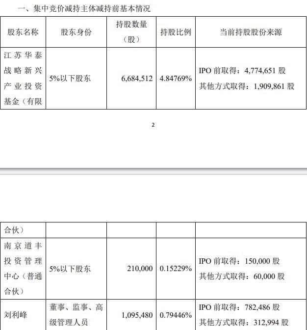 本次减持计划实施前,公司股东江苏华泰战略新兴产业投资基金(有限合伙)(以下简称“江苏华泰”)持有公司股份6,684,512股,占公司总股本的4.84769%;公司股东南京道丰投资管理中心(普通合伙)(以下简称“南京道丰”)持有公司股份210,000股,占公司总股本的0.15229%。江苏华泰和南京道丰为一致行动人,合计持有公司股份6,894,512股,占公司总股本的4.99998%;公司董事兼高级管理人员刘利峰持有公司1,095,480股股份,占公司总股本的0.79446%。上述股份来源于公司首次公开发行前持有的股份以及公司实施资本公积金转增股本,已于2022年9月1日上市流通。