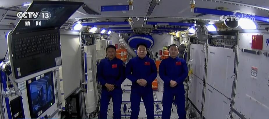 神舟十六号乘组:我是航天员景海鹏,欢迎大家来到“天宫课堂”。我是航天员朱杨柱,我是航天员桂海潮,让我们一起开始这一场探索之旅,让我们带领大家走进新教室。