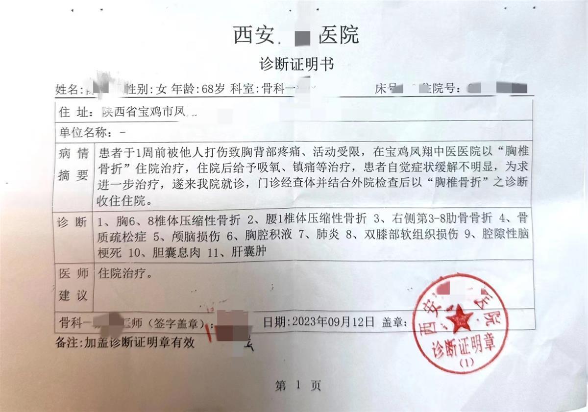 张女士提供的西安某医院诊断证明显示,患者于一周前被他人打伤致胸背部疼痛、活动受限,在凤翔某医院以“胸椎骨折”住院治疗,住院后给予吸氧、镇痛等治疗,患者自觉症状缓解不明显,为求进一步治疗来院就诊。门诊经查体并结合外院检查后,以“胸椎骨折”之诊断收住住院。张母被诊断为胸6、8椎体压缩性骨折,腰1椎体压缩性骨折,右侧第3-8肋骨骨折,双膝部软组织损伤等。