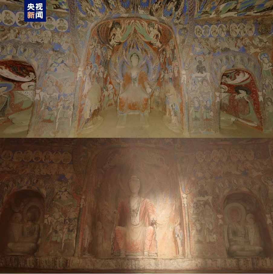 △上图:数字敦煌-莫高窟285窟实景 下图:寻境敦煌-游戏引擎渲染场景