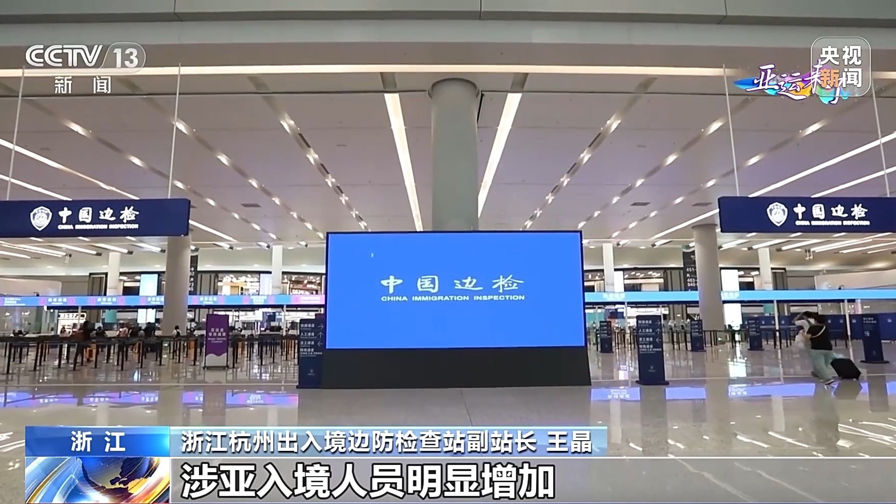 浙江杭州出入境边防检查站副站长 王晶:今天我们迎来了亚运参赛人员单日入境最高峰,从早上八点开始,涉亚入境人员明显增加,我们全体人员全天候在岗执勤,确保旅客顺畅通关。