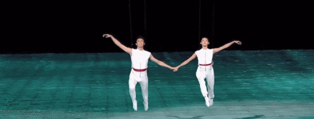裸眼3D的拱宸桥,一边连接着古代,一边通往现在。双3D威亚,把双人舞搬到了空中。时而融合,时而分开,这一技术是世界上首次在大型体育场里的应用,与地屏和网幕上呈现的钱江潮反复互动。