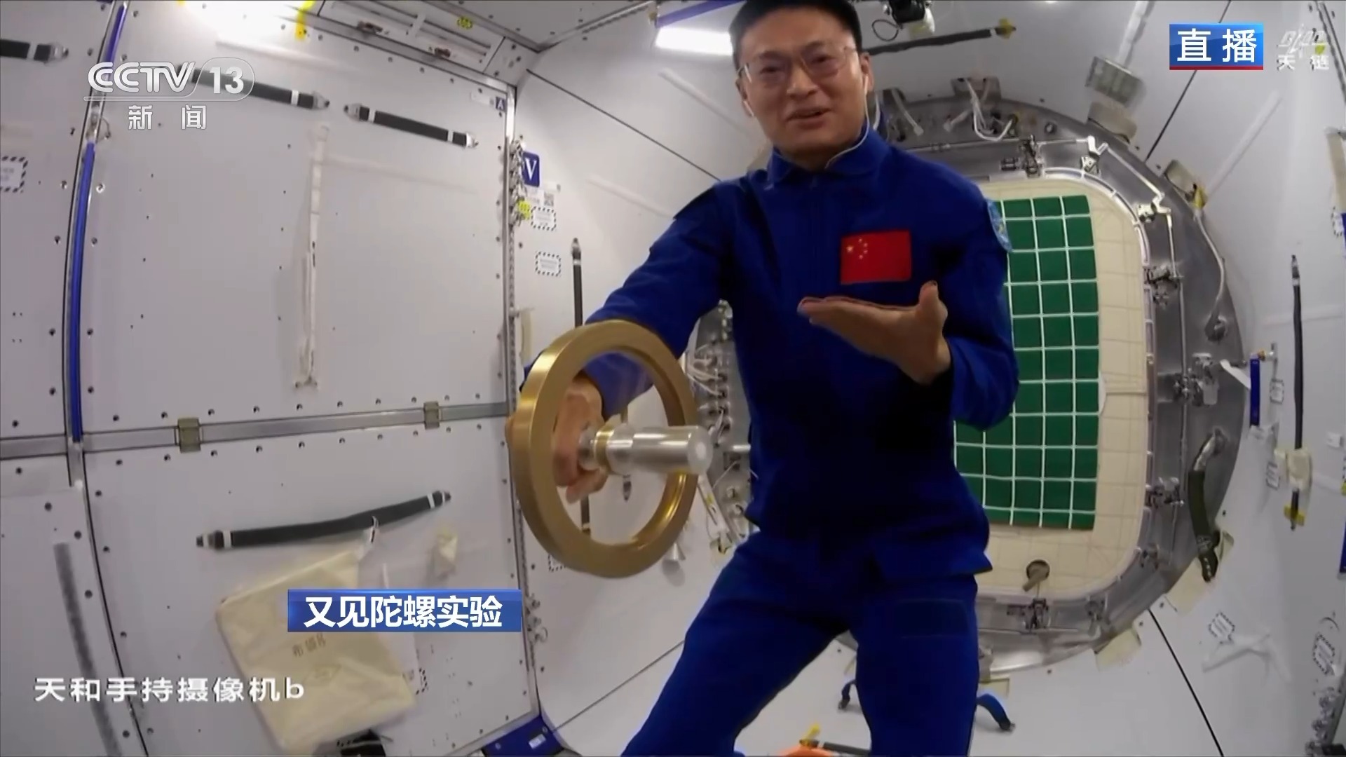 航天员 桂海潮:我准备用一个陀螺来做转身。我先做第一个演示,陀螺静止没有转起来时,在我改变陀螺方向的过程中,我的身体姿态并没有发生明显改变。接下来,我准备做第二个演示,陀螺自转时,我改变陀螺的方向,我也发生了转身。