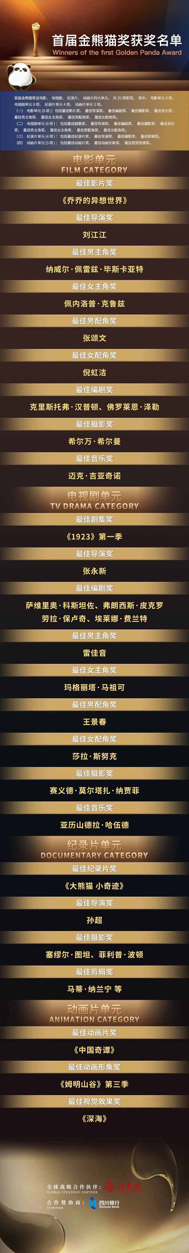 首届金熊猫奖获奖名单。首届金熊猫奖组委会供图