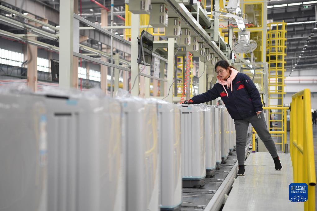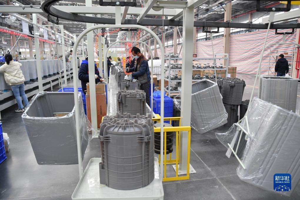 在西安国际港站附近的一家家电生产企业内,工人在生产线上组装洗衣机(2月22日摄)。