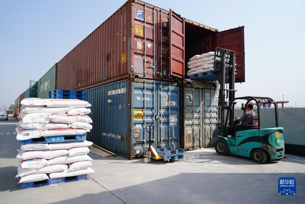 在西安国际港站附近的一家农产品物流加工园区内,工人用叉车卸下中欧班列长安号运回的进口面粉(2020年4月8日摄)。