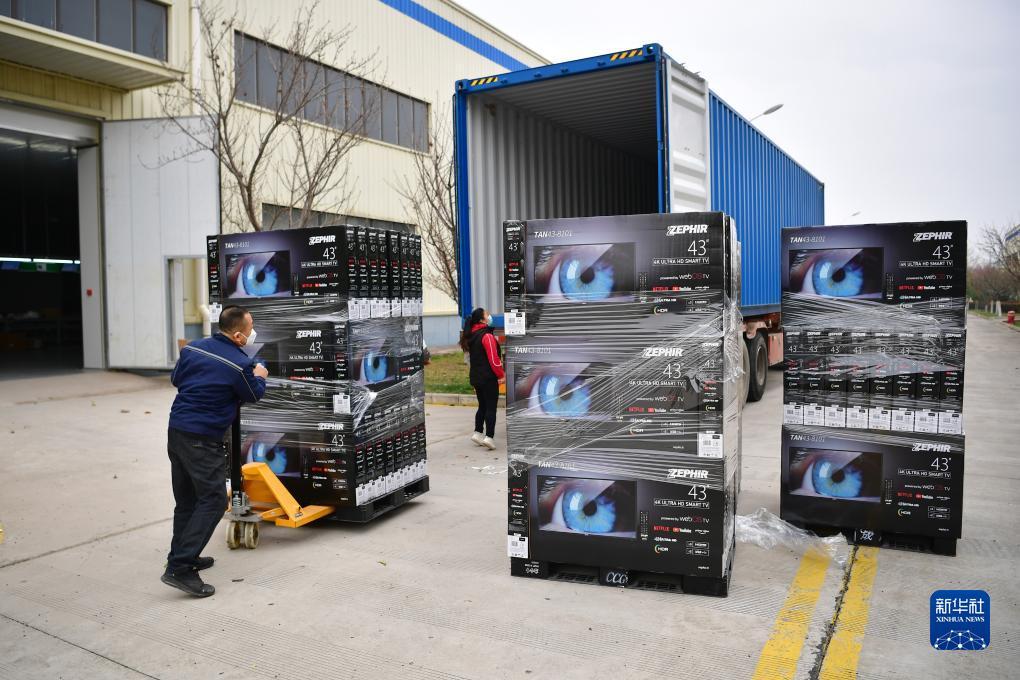 在西安国际港站附近的一家显示器生产企业内,工人在装箱产品,准备发货(2022年3月17日摄)。