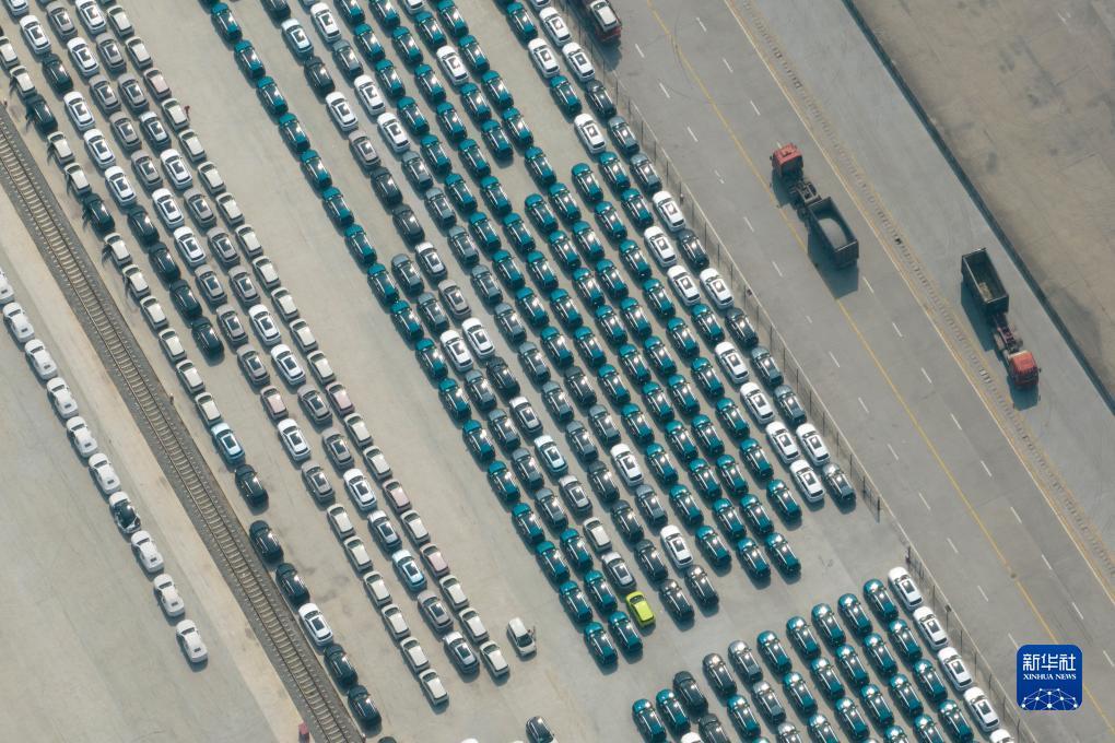 这是西安国际港站内存放汽车的物流基地(9月7日摄,无人机照片)。