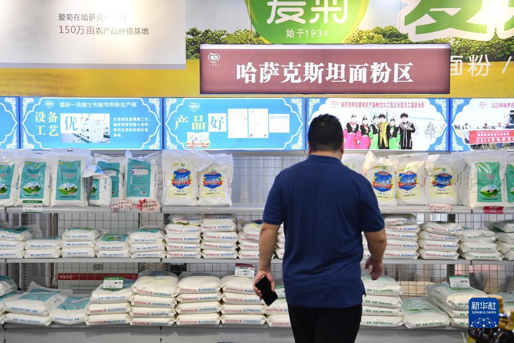 9月22日,在西安国际港站附近一家超市内,顾客选购中欧班列长安号运回的进口面粉。