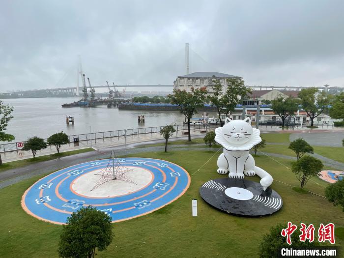 9月24日,参观者俯瞰Tango的作品《白猫留声机》,约6米高的白猫装置矗立江边,与白猫主展馆相呼应。中新网记者 郑莹莹 摄