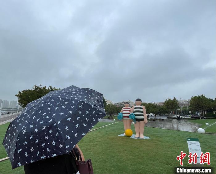 9月24日,2023上海城市空间艺术季在雨中启幕,参观者在欣赏户外作品——法国艺术家夫妇克莱达特&佩蒂皮耶的《沐浴者》。中新网记者 郑莹莹 摄