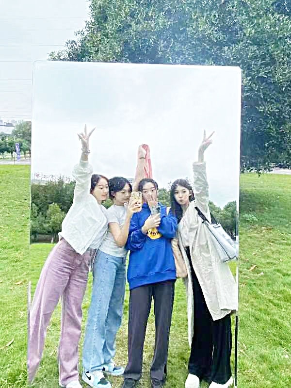 “我平常很喜欢拍照,于是就想着在校园某个角落放一面全身镜子,大家都可以来打卡留影。”21级网络与新媒体专业的刘希文是这面镜子的主人,她告诉记者,这面镜子的摆放位置很巧妙,在校园草坪上,正面朝向学校的门头,在这里拍照打卡,同时也能与学校来一张合影。