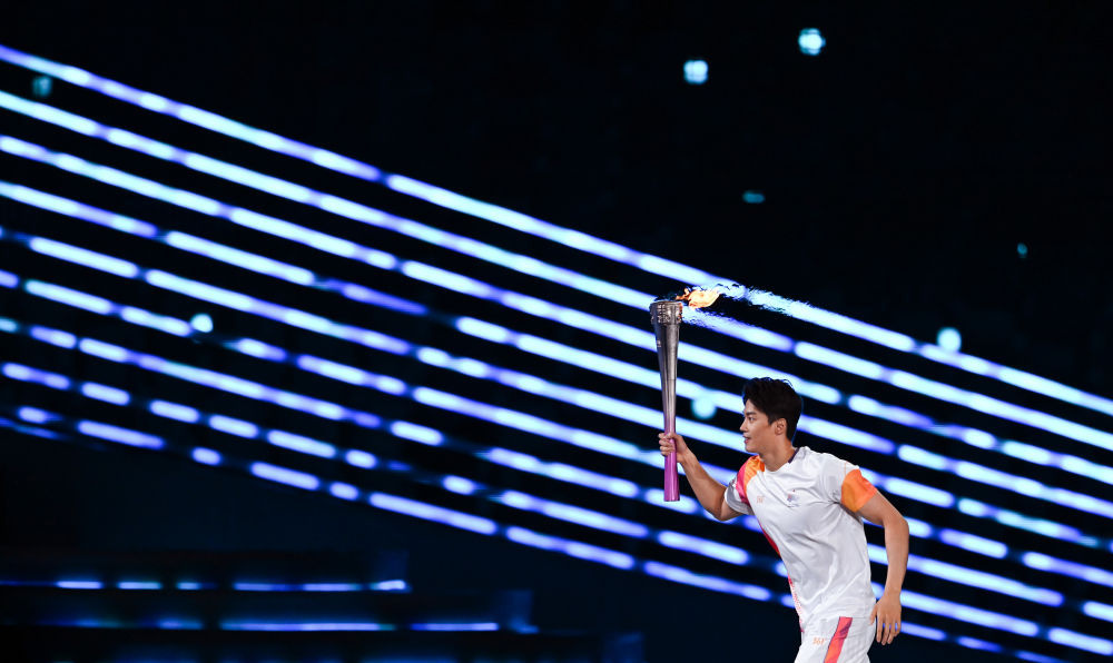 9月23日,火炬手汪顺在开幕式上进行火炬传递。新华社记者 李一博 摄