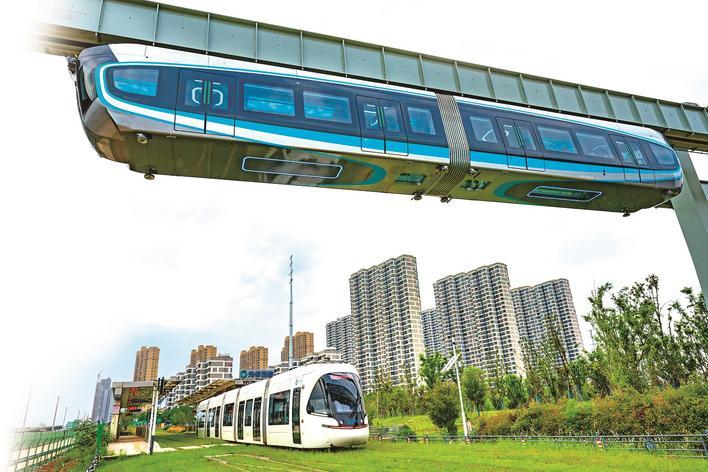 光谷空轨列车试车与光谷量子号有轨电车相遇。