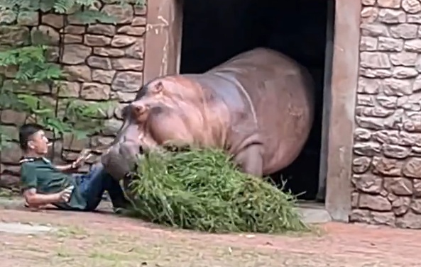 ·长沙生态动物园回应“河马攻击饲养员”:两只河马打架,饲养员劝架不小心摔倒。