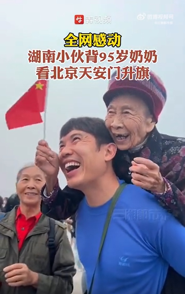 近日,湖南一名男子背着95岁的奶奶,从永州出发到北京天安门看升国旗。看着五星红旗冉冉升起,祖孙两人露出了幸福的笑容。网友:这是“最美的风景”。