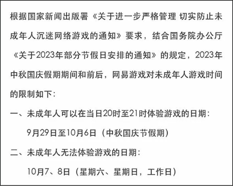 ·多个游戏平台发布中秋国庆假期未成年人游戏限时通知。