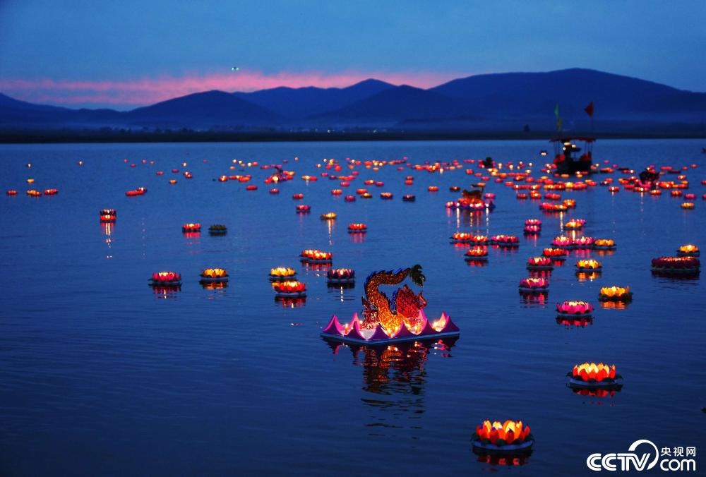 9月24日,吉林,蛟河市漂河镇富江村举行丰收节放河灯活动,村民和游人把一盏盏河灯放入松花湖中,表达对美好生活的向往与期盼。