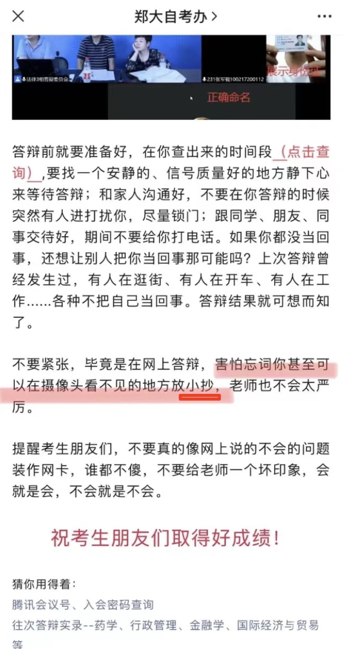 ·郑州大湖南一生答辩时“放小抄”?官方回应:表述用词不当,不能用‘小抄’。本意是指答辩参考材料,跟作弊是两码事,今后会做修改。