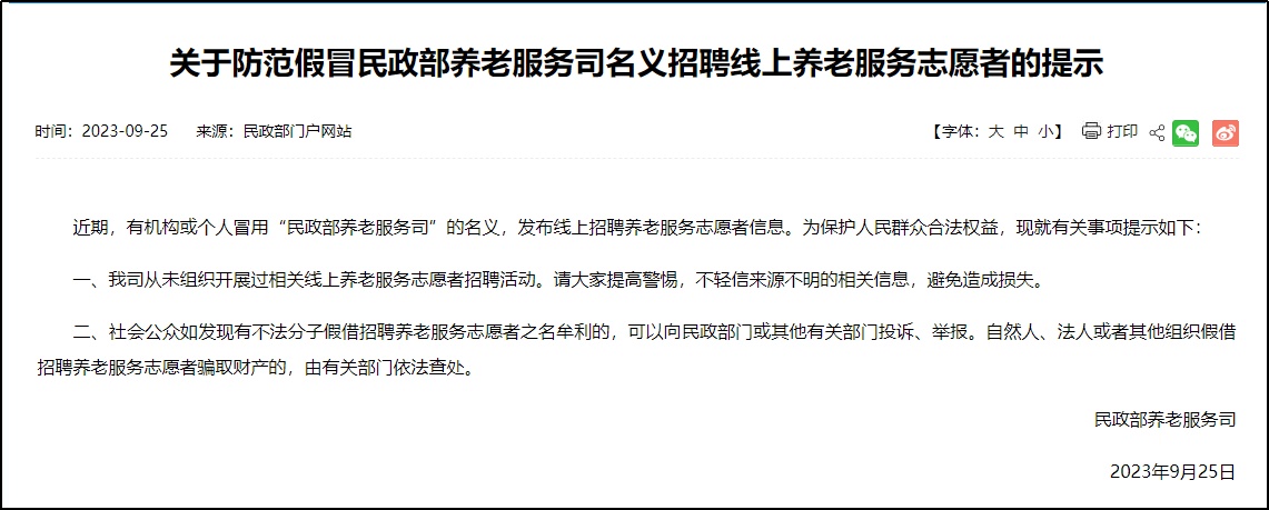 ·有机构或个人冒用“民政部养老服务司”名义招聘志愿者,民政部发布提示。