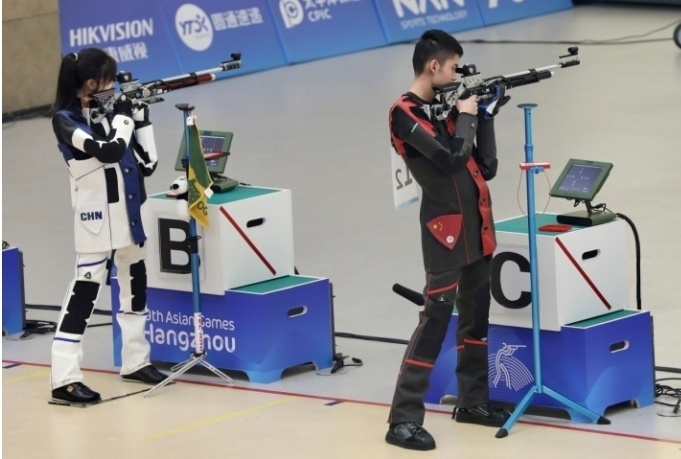 9月26日,在富阳银湖体育中心举行的杭州亚运会射击混合团体10米气步枪决赛中,年轻的男女10米气步枪冠军盛李豪和黄雨婷组队,以16比2强势打败乌兹别克斯坦队,为中国代表队再添一金。