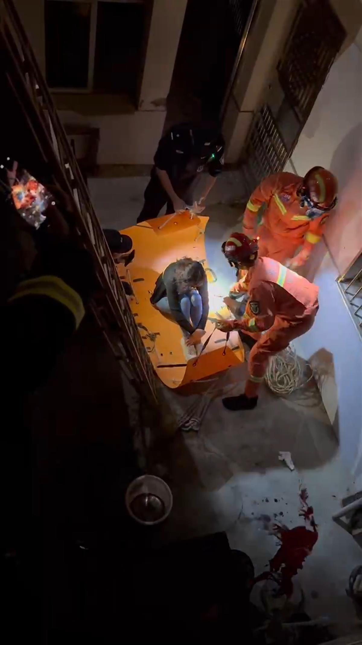 出警民警见状,立即跳入3米多深的地下室,检查姜某伤情,发现其头部流血,腿部疑似骨折。民警尝试与其交流,询问状况,但姜某只能发出微弱的呻吟,状态极差。