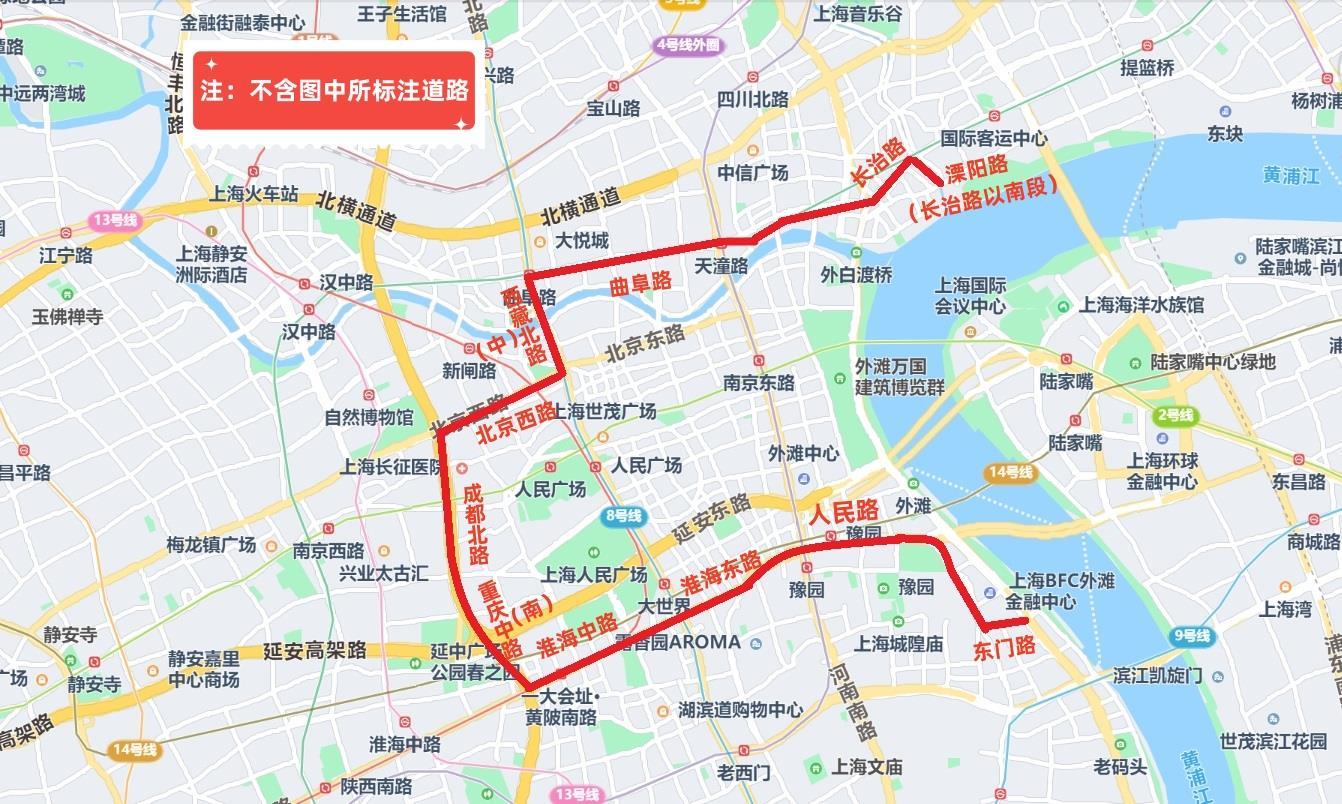 沿溧阳路(长治路以南段)—长治路—天潼路—曲阜路—西藏北路—西藏中路—北京西路—成都北路—重庆中路—重庆南路—淮海中路—淮海东路—人民路—东门路及黄浦江边所围合区域内的地面道路(不含上述道路),禁止机动车通行。