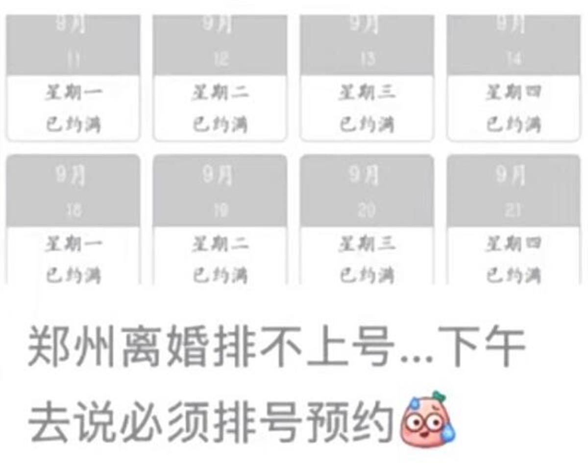 25日,微博网友“土味街拍大赏 ”发布一张截图称,离婚排不上号。图片标注地点为河南郑州。26日,“离婚排不上号”相关话题登上微博热搜,引发网友热议。有网友称,一天只放5个号,排到几个月后了;还有网友表示,可能是因为系统升级导致的。