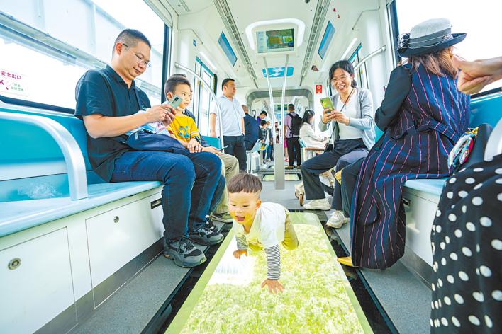 “手机扫码甚至刷脸,就可以买票进站。车上看风景太酷了,从未有过的空中视角,像时光列车,脚下是光谷生态大走廊,各种花草美极了。”来自汉口的刘女士,一大早就约了五六位姐妹,到高新大道站上车后,兴奋地说。
