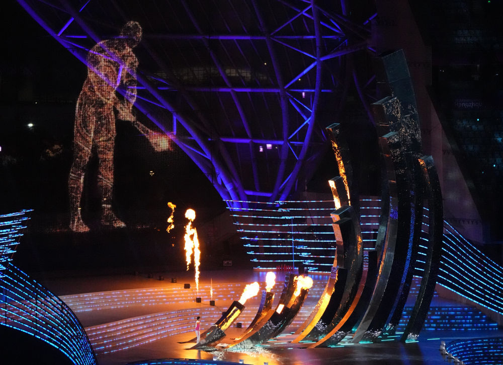9月23日,火炬手汪顺和数字火炬手在开幕式上点燃主火炬。新华社记者 江文耀 摄