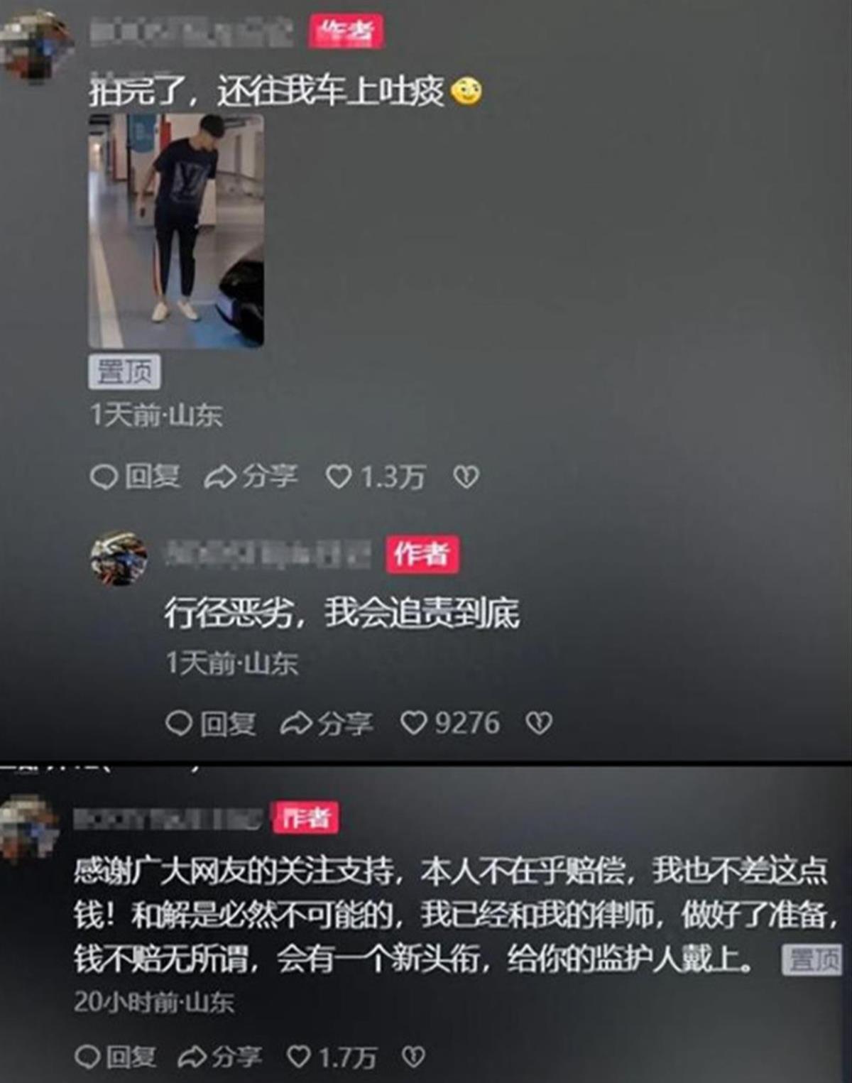 而在此次的事件中,这些踩车并拍照的少年,并不是因为过失或意外造成他人车辆损害,而是纯粹为了满足自身的虚荣心和破坏欲,肆意损坏他人财物,还冲着别人的车吐痰,不但伤害性很大,而且侮辱性极强,主观恶意非常明显,莫名其妙地遭受这样的恶意,任谁都会觉得很生气,想要讨个公道吧。