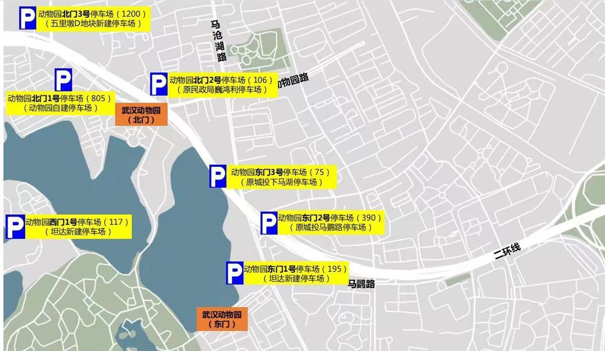 在武汉动物园周边,共有武汉动物园北门1号、2号、3号停车场、东门1号、2号、3号停车场和万科未来中心、江腾广场等13个社会公共停车场,游客可通过“汉阳泊车”微信小程序和手机地图APP,提前选定停车场,规划行车路线。