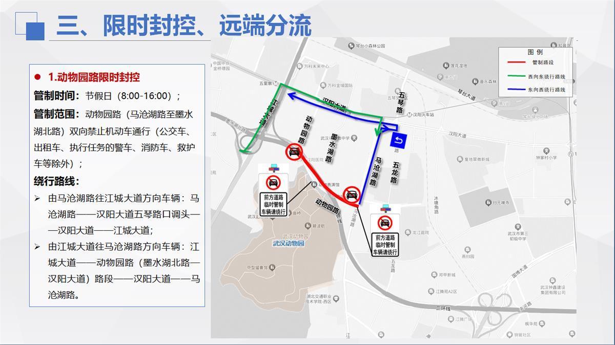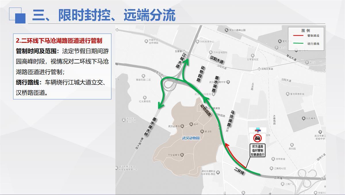 2、禁行路段:周六、周日、法定节假日(8:00-16:00)动物园路(马沧湖路至墨水湖北路)双向禁止机动车通行,公交车、出租车(含网约车)、执行任务的警车、消防车、救护车等除外。游园高峰时段,视情对武汉动物园周边道路及二环线下马沧湖路匝道实行临时交通管制。