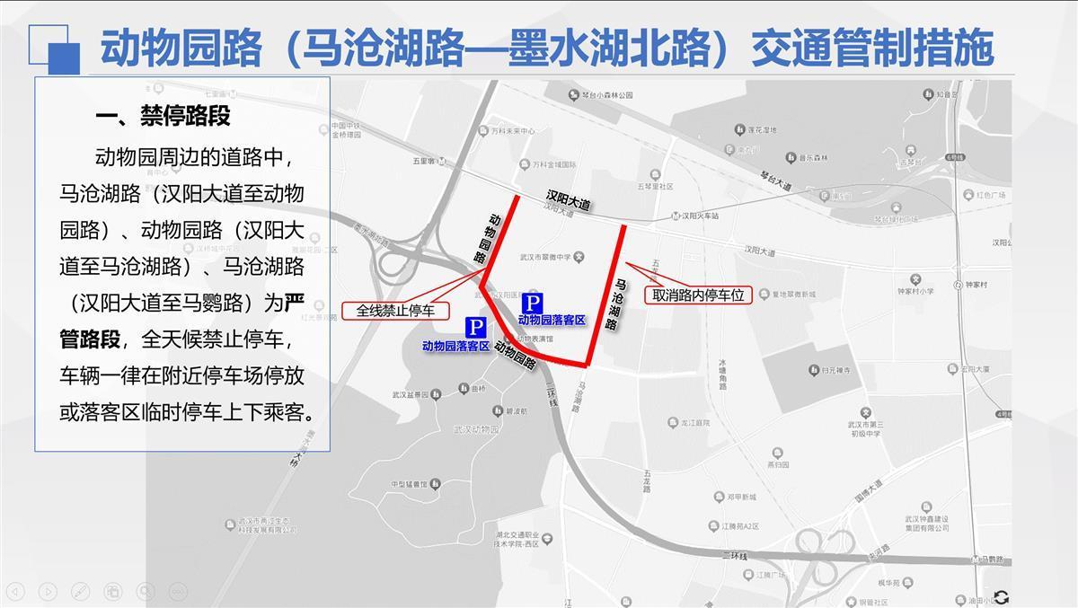 1、禁停路段:动物园周边道路动物园路(汉阳大道—马沧湖路)、马沧湖路(汉阳大道—马鹦路)为严管路段,全天候禁止停车,车辆一律在附近停车场停放或落客区临时停车上下乘客。