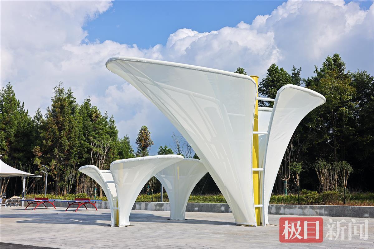 在广场上,主题雕塑提取光谷代表性建筑马蹄莲、星河转盘等景观元素,通过形态演绎形成特色形象展示。项目还采用光谷地标性建筑飘带的元素设计特色长凳,安置在丛林广场等重要景观节点中,方便游客休憩。