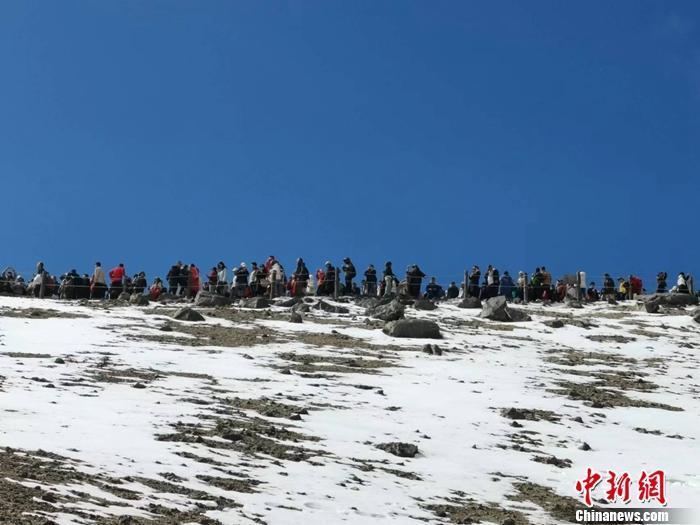 近日,记者走上长白山顶,游客熙熙攘攘,天池景色引人排队打卡拍照。