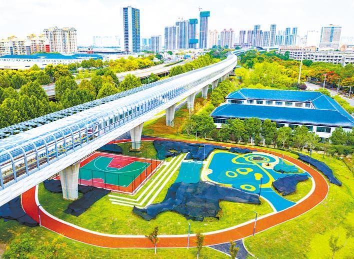 9月17日,武汉地铁5号线调整工程红霞站和黄家湖(武科大)站之间,高架桥上地铁列车奔驰而过,高架桥下城市公园清幽惬意。近年来,武汉市实施地铁配套绿化建设,在地铁站口建设了一批口袋公园、园林小景等,方便市民休憩游玩。 (湖北日报全媒记者 魏铼 摄)