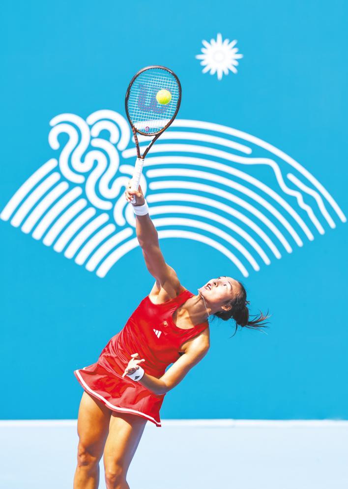 在9月27日进行的杭州亚运会网球女子单打1/4决赛中,赛会头号种子、湖北十堰的郑钦文以2比0击败韩国选手朴昭炫,挺进四强。半决赛郑钦文将对阵赛会4号种子、菲律宾选手埃亚拉。图为郑钦文发球瞬间。
