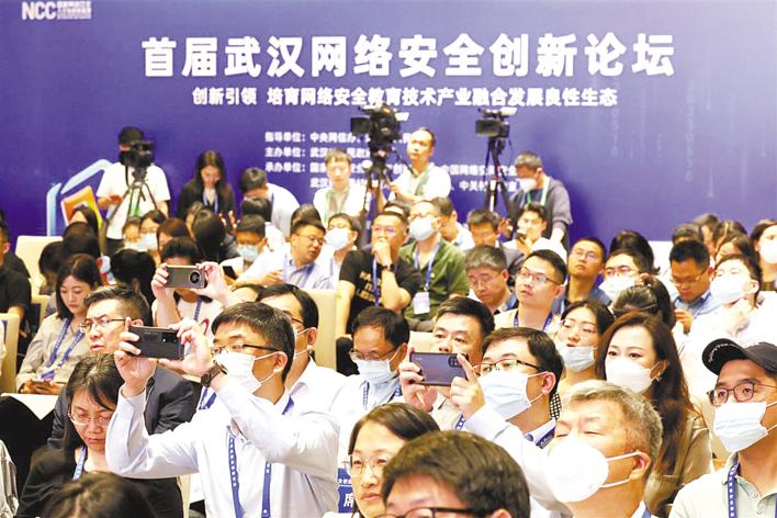5月17日,首届武汉网络安全创新论坛主论坛在武汉临空港国家网络安全与人才创新基地举行。 (湖北日报全媒记者 倪娜 通讯员 晏君 徐一帆 摄)